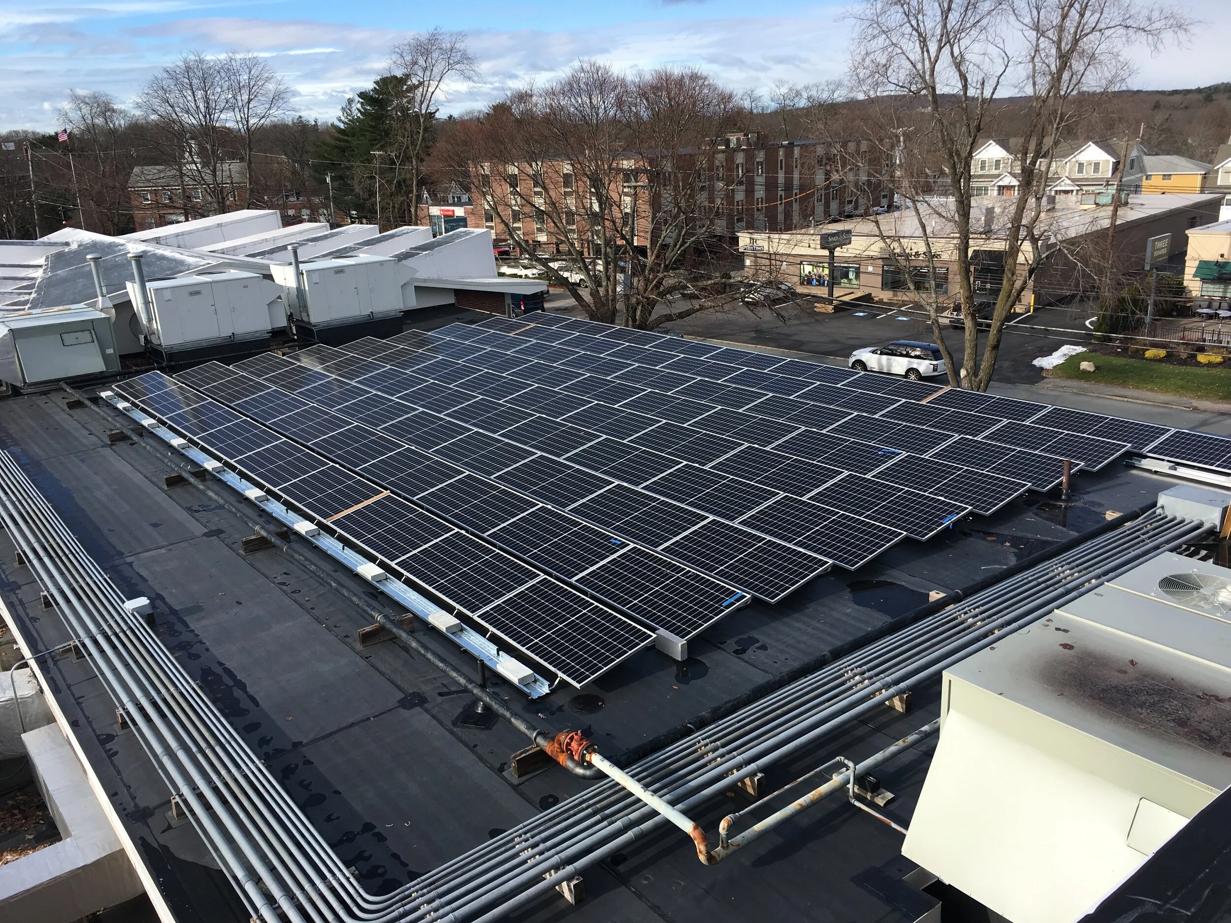 Ballasted roof-mount system includes 297 390-watt solar panels and 3 inverters. DC-DC Optimizers minimize shading effects and provide module level monitoring. Project installed without disruption over an active school and day care operation.